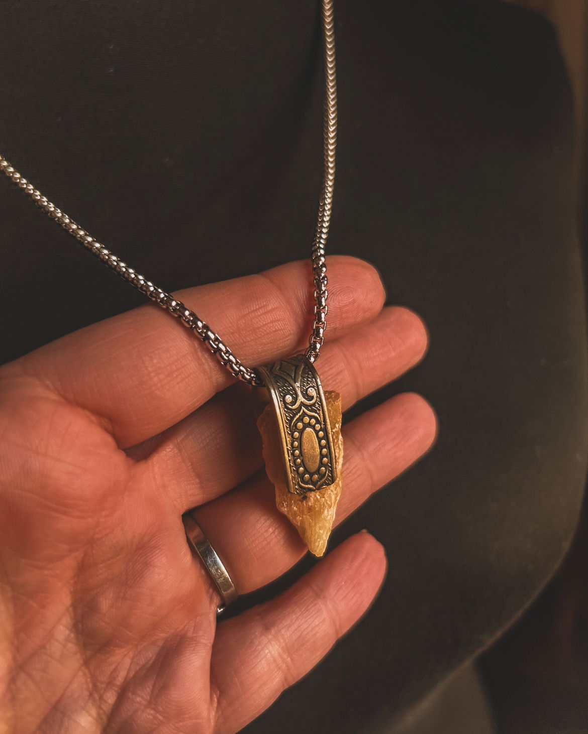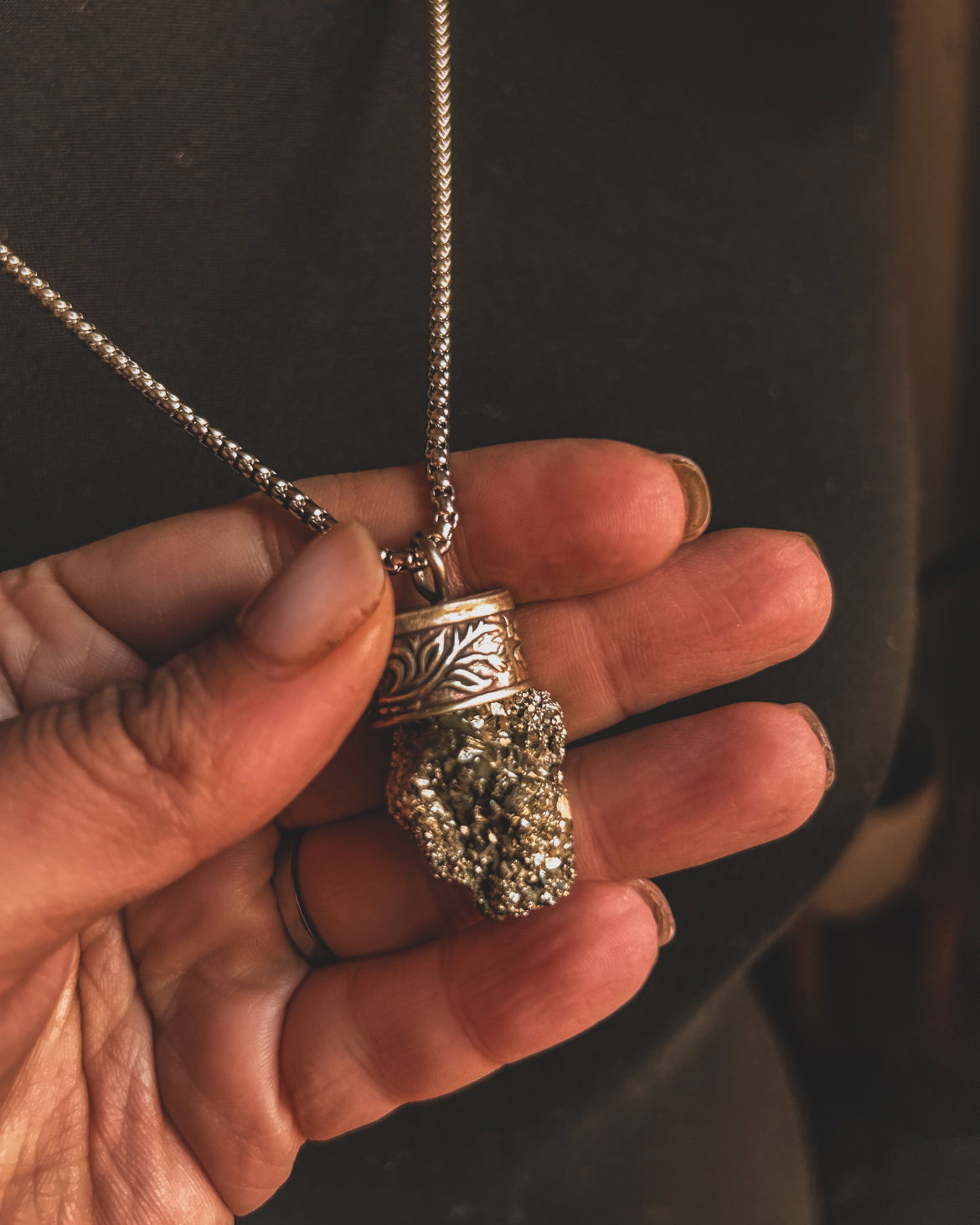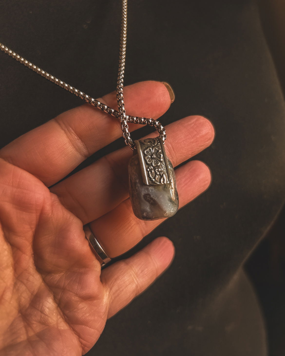 piedras energeticas en dije y capuchones de alpaca labrado
