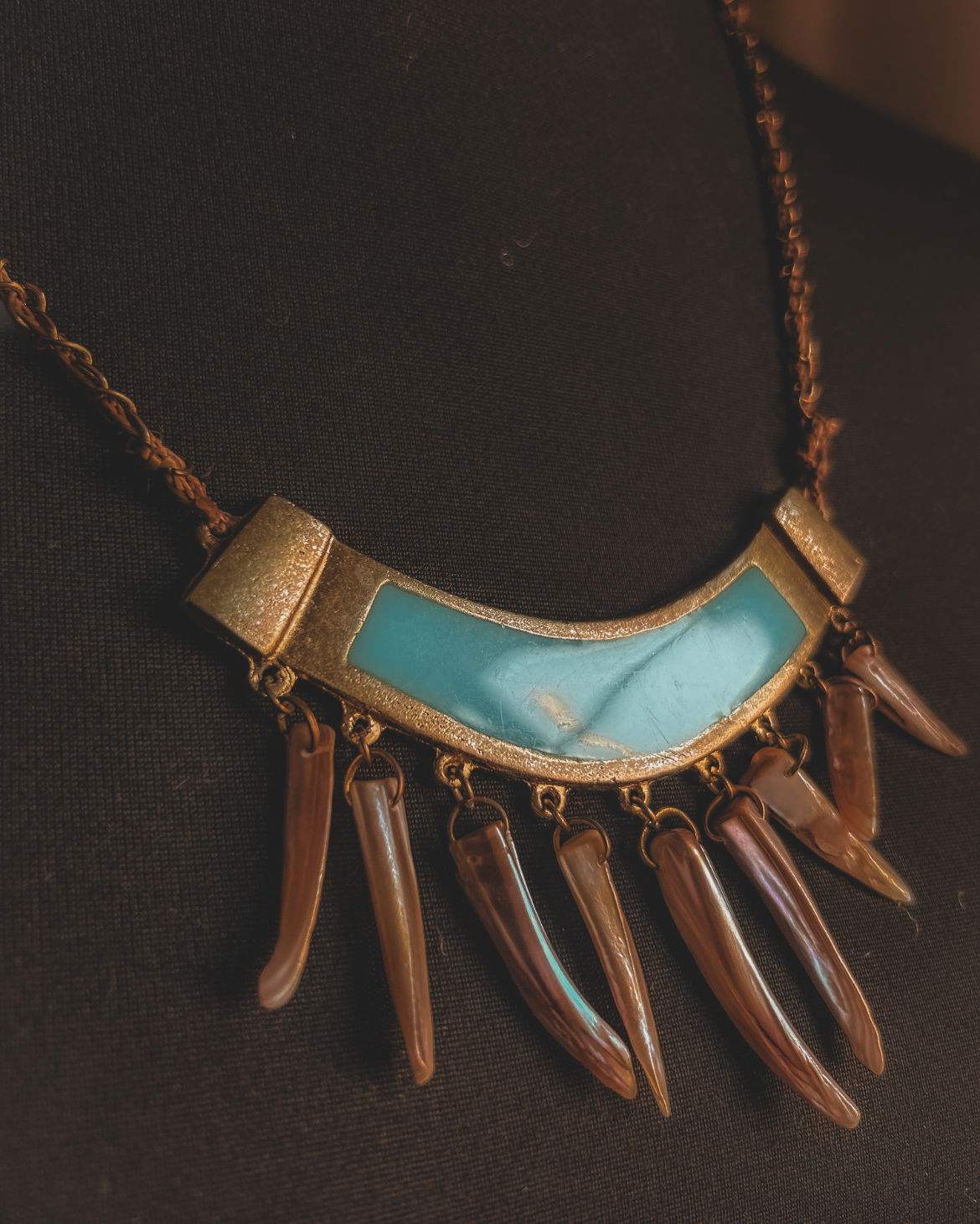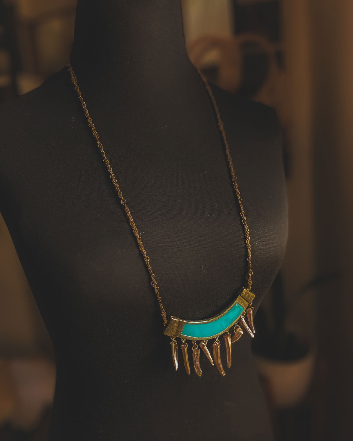 realizado con colmillos de mica y base con esmaltado en turquesa