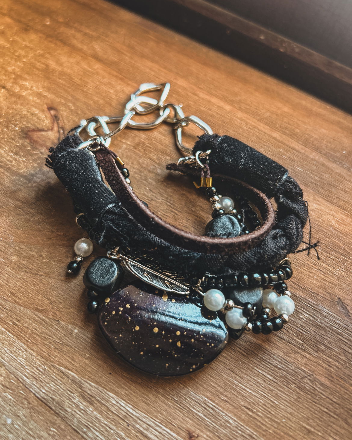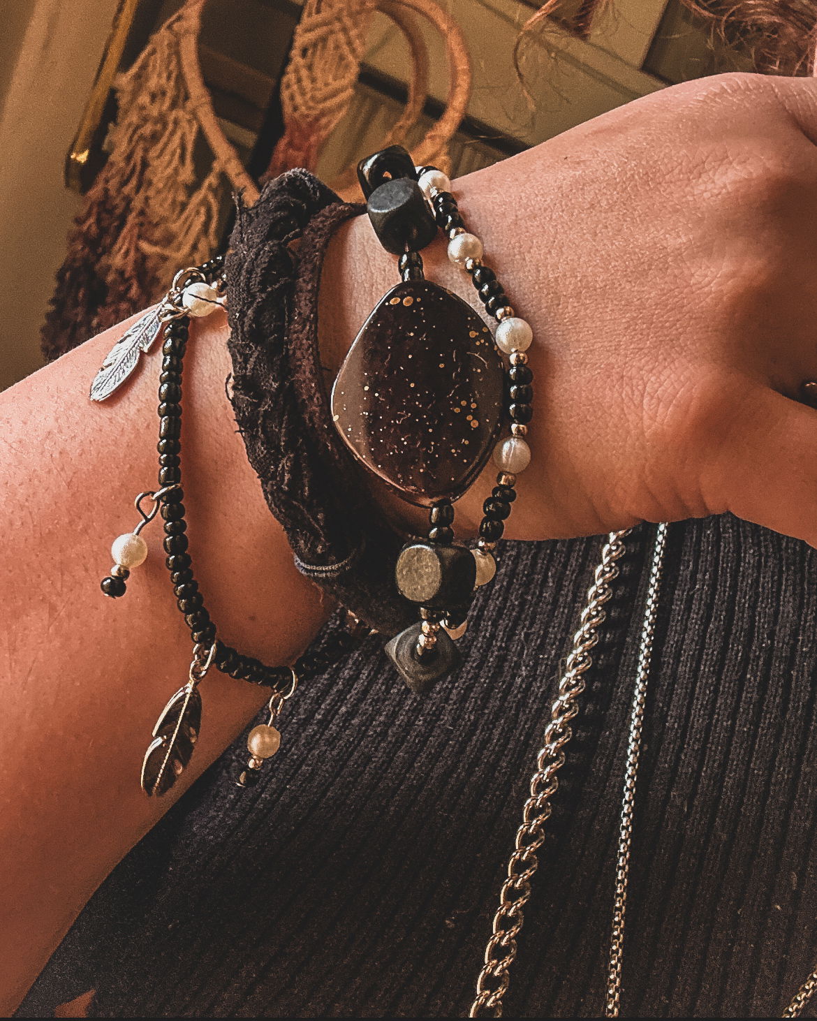 realizada de forma artesanal con cuentas de piedras naturales, cuentas de mades, cuentas metalicas mostacillones y dijes
