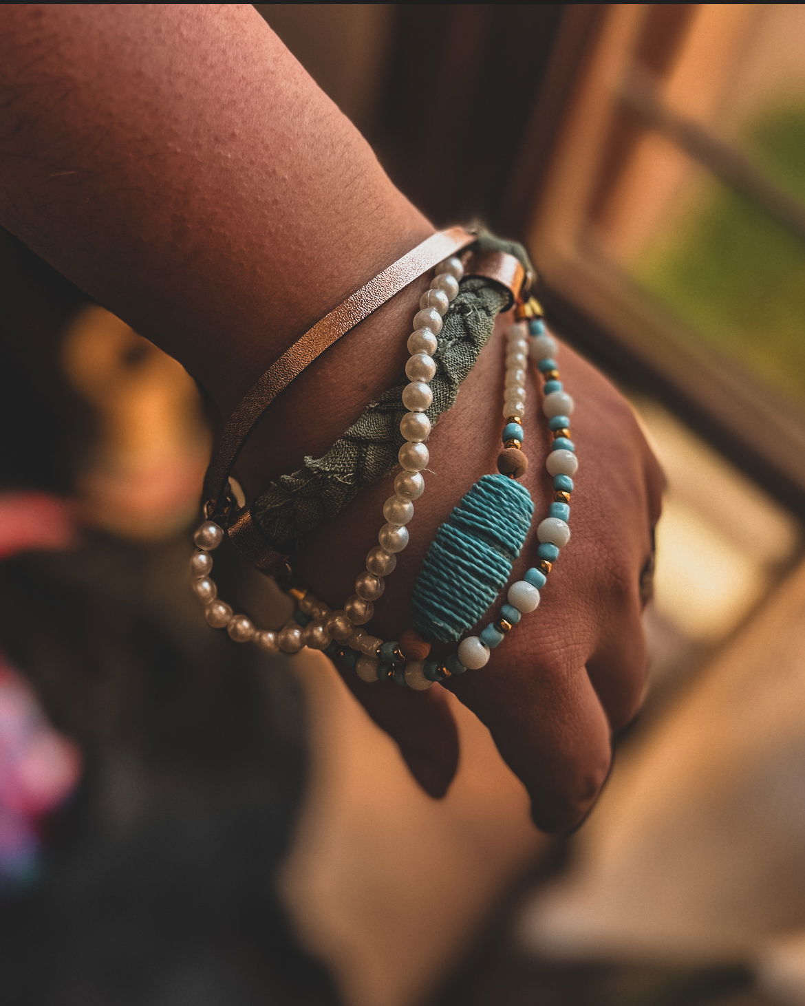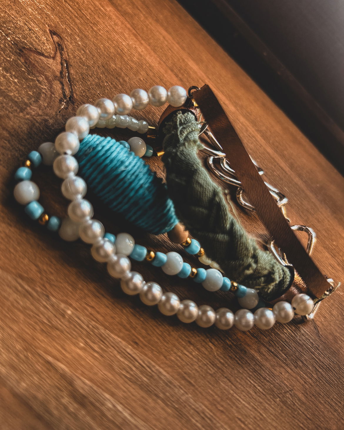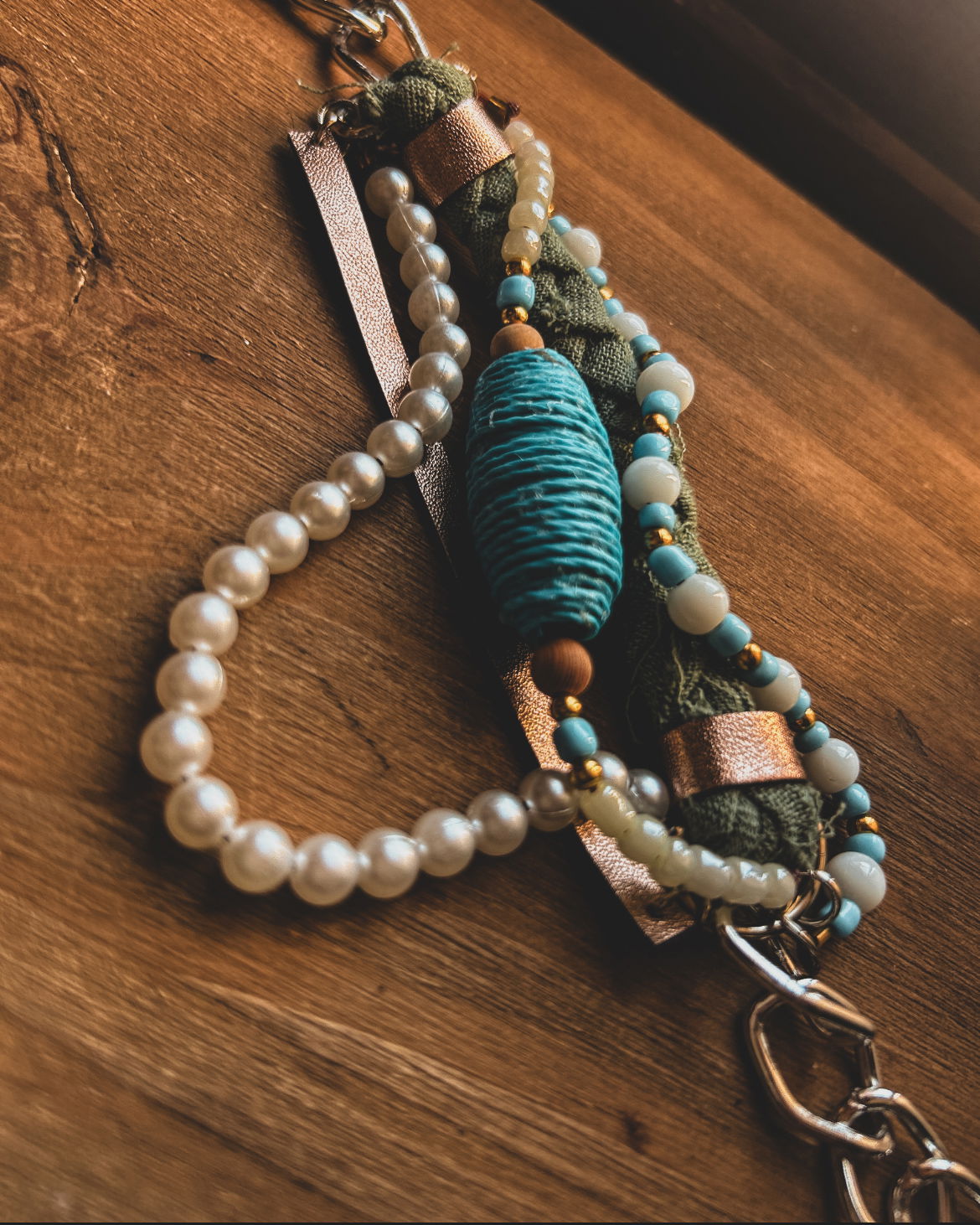 realizada de forma artesanal con cuentas de piedras naturales, cuentas de mades, cuentas metalicas mostacillones y dijes