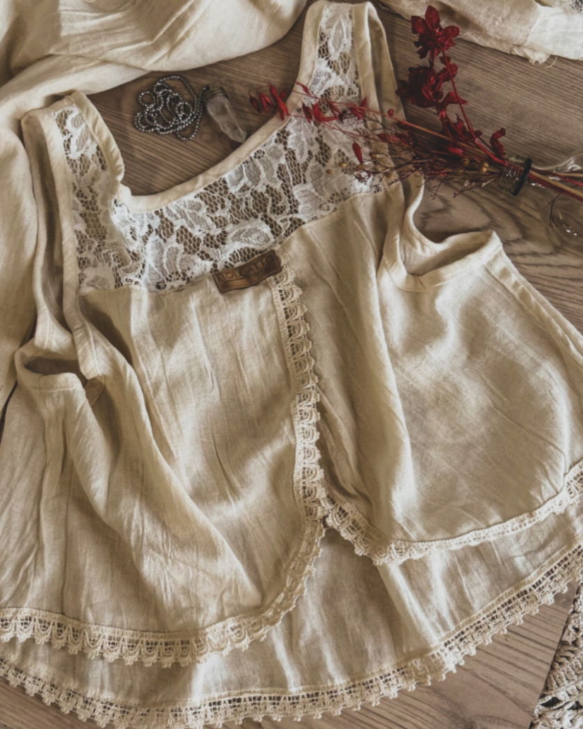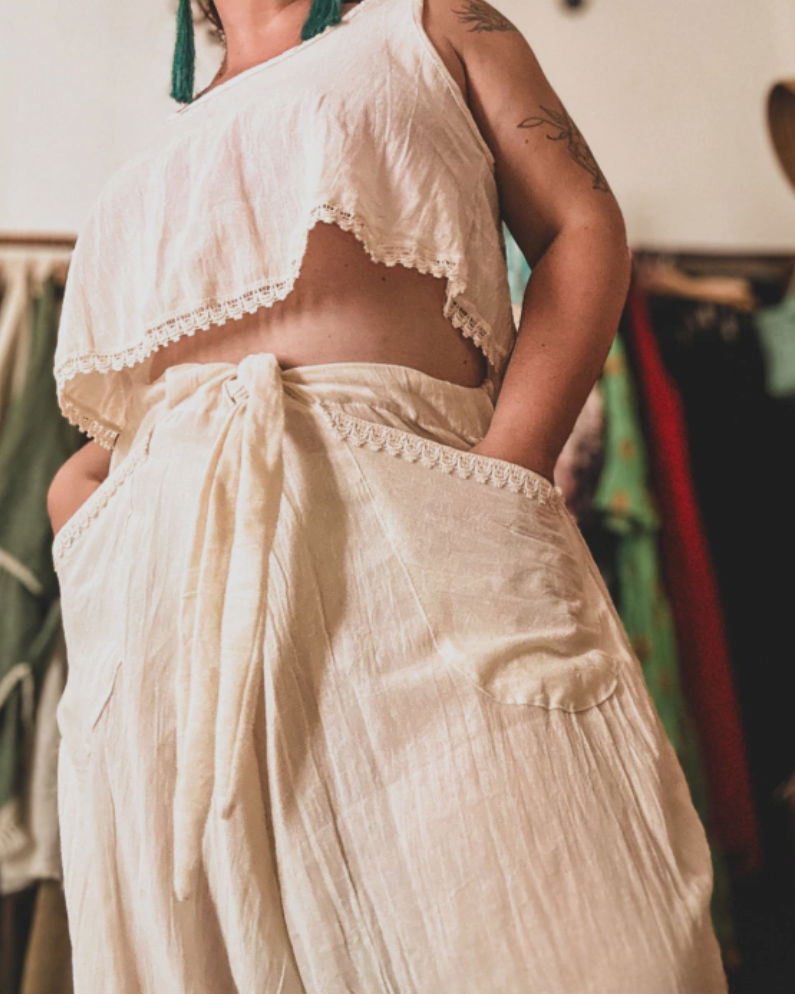 Hermosa blusa corta bohem cruzada en espalda con detalle de encaje