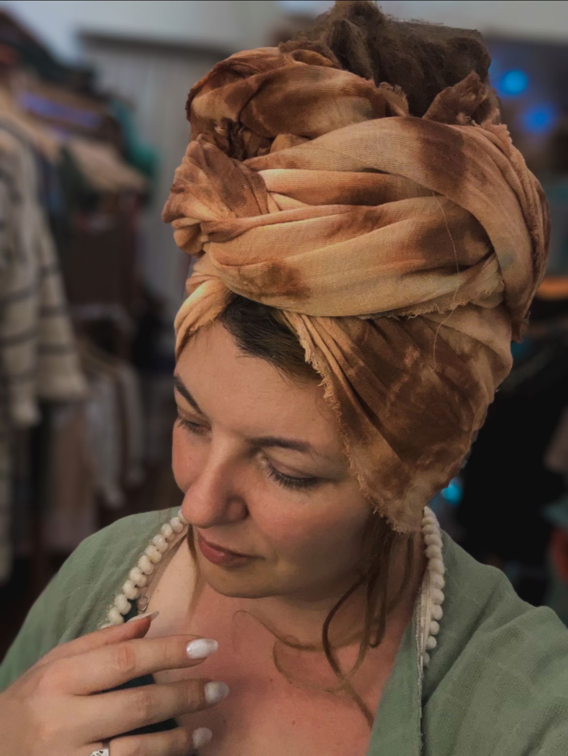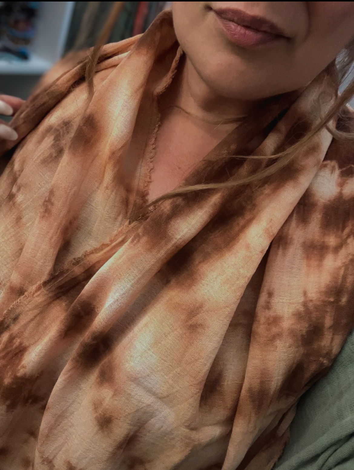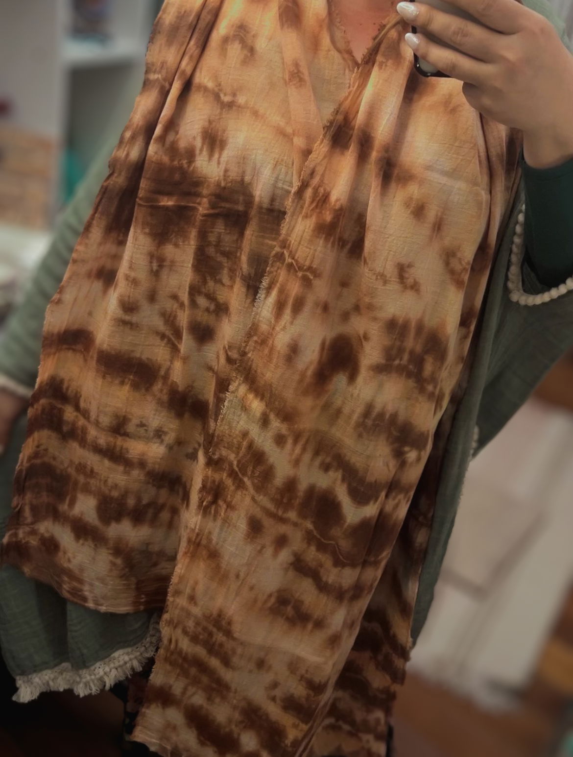 Precioso pañuelo realizado con tecnica de teñido artesanal tie dye, cada uno es completamente unico en su diseño y color, lo podes usar en la cabeza, en el cuello, como top, como pareo!