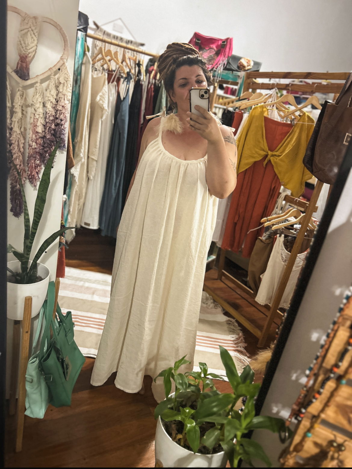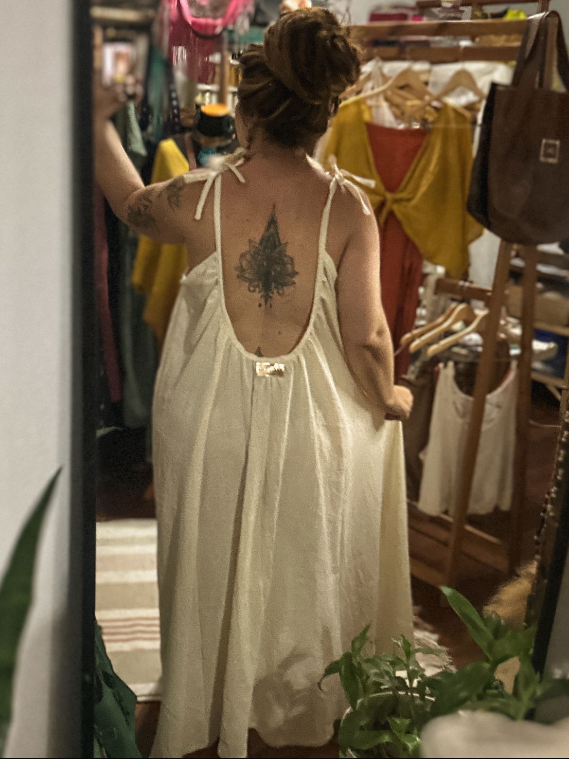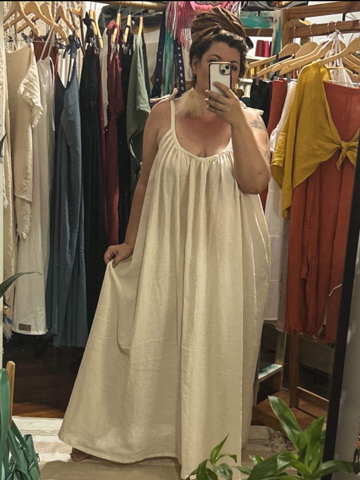 es un vestido amplio que se regula con los breteles el largo y profundidad del escote, muy fresco y facil de adaptar a diversos estilos, pero siempre con un toque bohemio