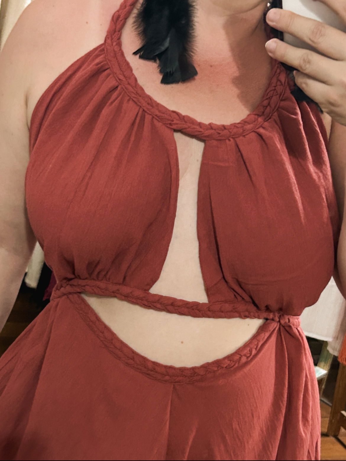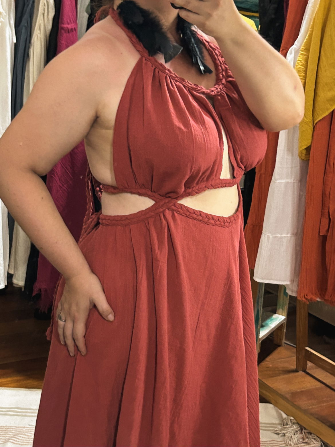 el escote es una gargantilla trenzada para ajustar en el cuello la altura ideal, por debajo del busto las trenzas se entrecruzan para ser ajustadas en la espalda a gusto, (cuenta con elastico en la parte de la cintura para una mejor adaptabilidad a diferentes cuerpos) dejando ver ademas una parte el vientre como simbolo de la belleza del vientre femenino sin exponernos a incomodidades.
